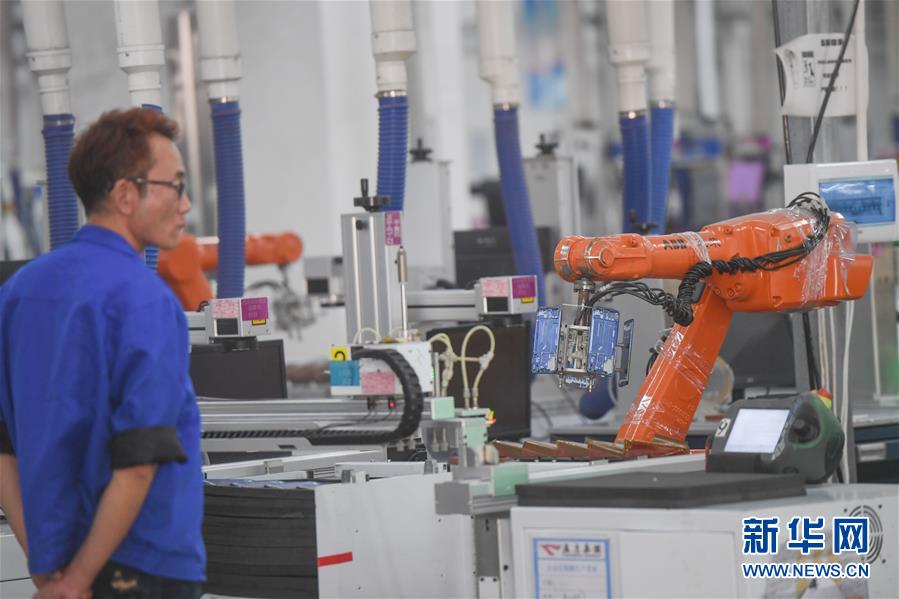 11月29日,在位于福建省石獅市蚶江鎮(zhèn)的通達集團生產(chǎn)車間,工人在智能機械臂旁實時監(jiān)控一批小米手機殼的生產(chǎn)情況。 新華社記者 宋為偉 攝