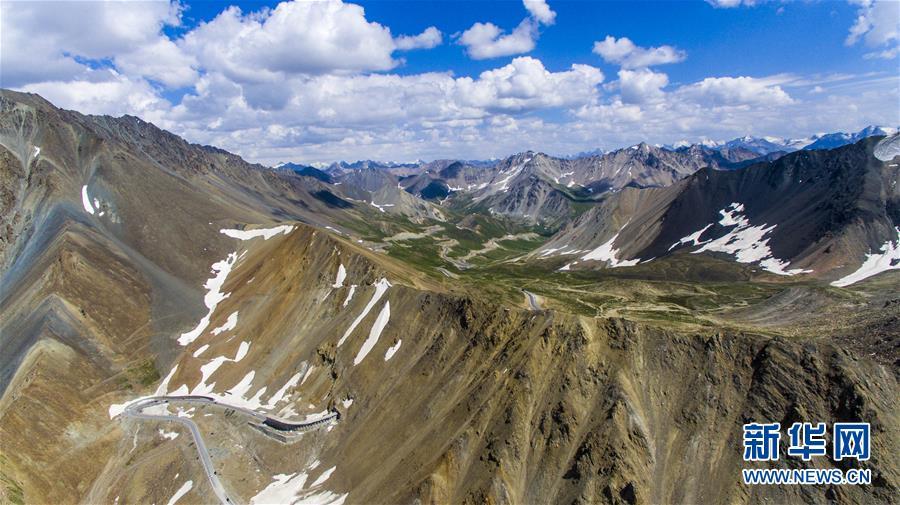 獨(dú)庫公路穿越海拔3390米的哈希勒根達(dá)坂(2017年7月13日無人機(jī)拍攝)。 新華社記者 江文耀 攝