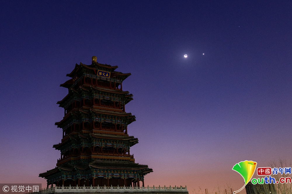 2018年12月4日,北京,金星合月天象。金星位于月亮以南3.6度左右的位置上。在這個時間附近,以肉眼從地面看去,金星與月亮的二維距離在夜空中看起來是比較接近的,但是在三維空間上,它們的距離是非常遙遠的(大約6000萬千米)。圖片來源:視覺中國