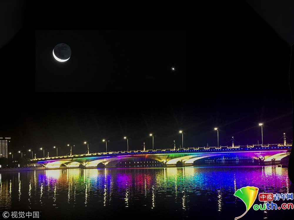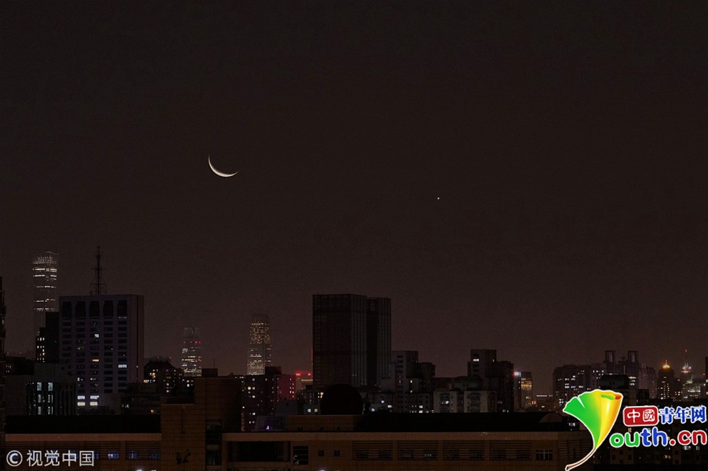 北京,天宇上演“金星合月”,清晨5點(diǎn)時(shí),東南方低空出現(xiàn)一顆明亮的金星和一彎窄月近距離相依相伴的美麗畫面。