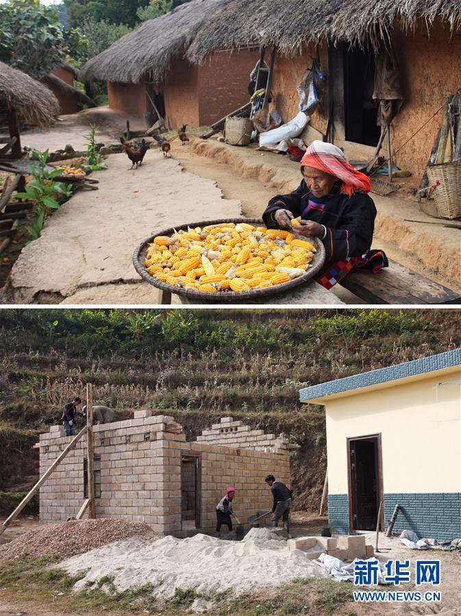 這是一張拼版照片。上圖:12月3日,在云南省瀾滄拉祜族自治縣南嶺鄉(xiāng)勐炳村龍?zhí)独险?1歲的李娜六老人在老宅前剝玉米;下圖:在云南省瀾滄拉祜族自治縣南嶺鄉(xiāng)勐炳村龍?zhí)洞迕裥〗M,李娜六老人的新宅正在建設(shè)中(12月3日攝)。 新華社記者杜涓涓攝