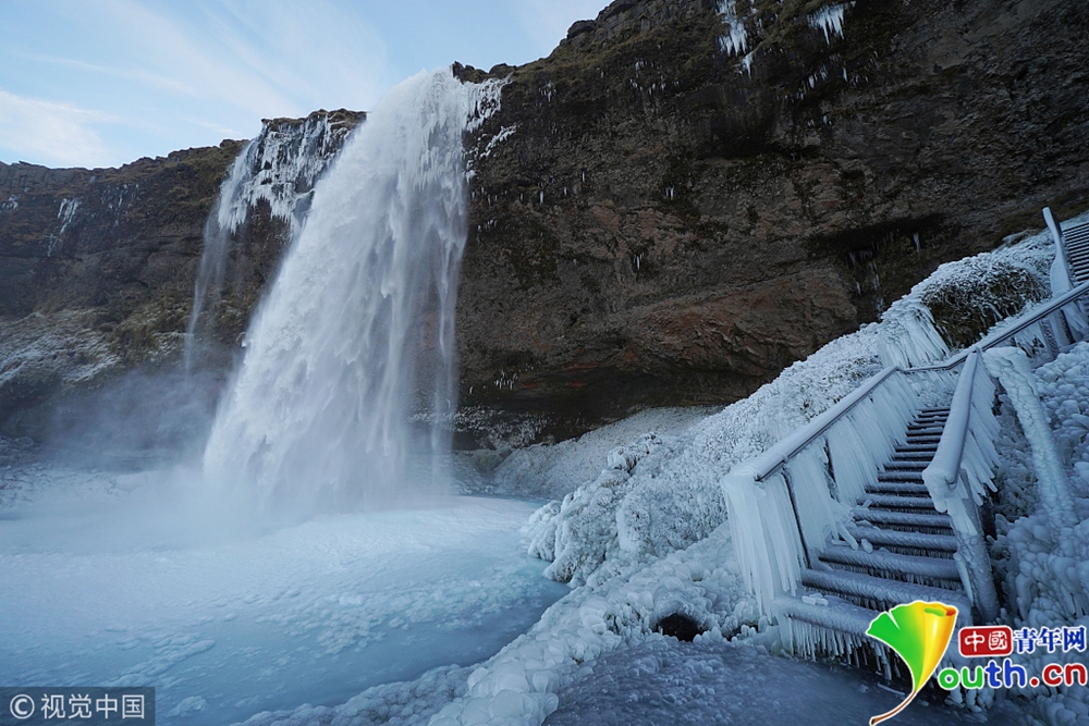 冰島瀑布結(jié)冰畫面震撼 如天外仙境