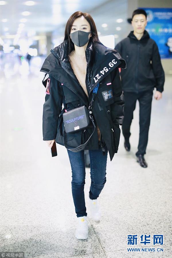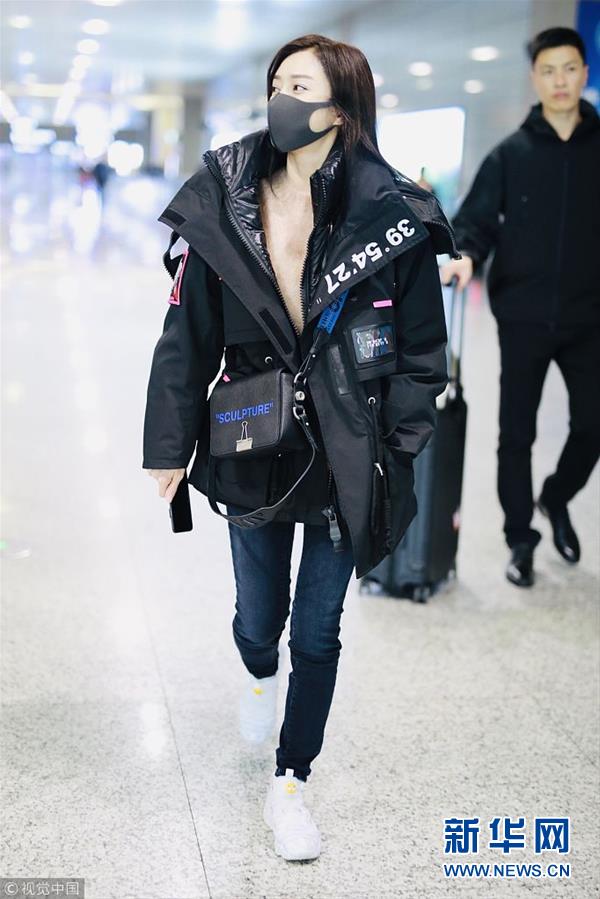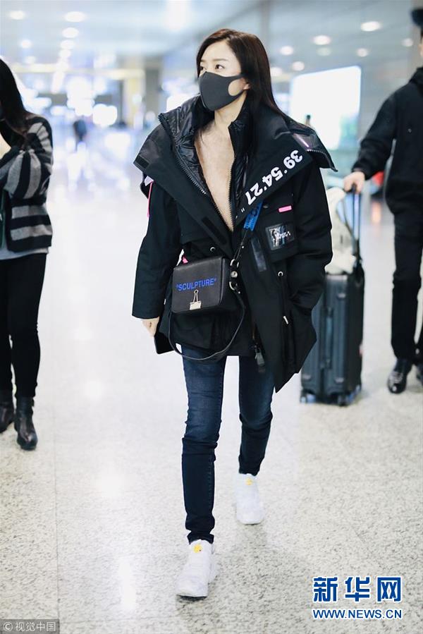 2018年12月3日,上海,秦嵐亮相機(jī)場(chǎng)。潮味棉服亮相機(jī)場(chǎng)變酷女孩,口罩遮面露甜笑心情靚。(圖片來源:視覺中國(guó))