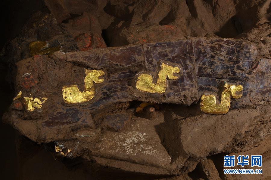 這是在位于河北行唐的考古實驗室內拍攝的局部車廂上鑲嵌有成組對稱的貼有金箔飾片的金屬質獸型牌飾(12月4日攝)。新華社記者 李賀 攝