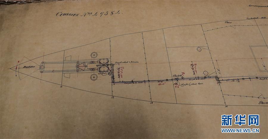 這是11月2日在英國(guó)紐卡斯?fàn)柕奶┒鳌枡n案館拍攝的致遠(yuǎn)艦設(shè)計(jì)圖紙。 新華社記者日前在紐卡斯?fàn)柼┒鳌枡n案館查找北洋海軍史料時(shí)發(fā)現(xiàn)一套七張、檔案名為“中國(guó)巡洋艦舵機(jī)設(shè)計(jì)圖”的原始圖紙。塵封百年,甲午海戰(zhàn)中抗擊日艦后沉沒(méi)的清北洋海軍致遠(yuǎn)艦部分原廠(chǎng)設(shè)計(jì)圖紙?jiān)谄浣ㄔ斓亍?guó)紐卡斯?fàn)柺械囊患覚n案館首次被發(fā)現(xiàn),為打撈那段悲壯的歷史提供了重要參考。 新華社記者 韓巖 攝