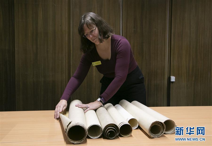 11月2日,在英國(guó)紐卡斯?fàn)柕奶┒鳌枡n案館,檔案管理員瑞秋·吉爾介紹致遠(yuǎn)艦設(shè)計(jì)圖紙。 新華社記者日前在紐卡斯?fàn)柼┒鳌枡n案館查找北洋海軍史料時(shí)發(fā)現(xiàn)一套七張、檔案名為“中國(guó)巡洋艦舵機(jī)設(shè)計(jì)圖”的原始圖紙。塵封百年,甲午海戰(zhàn)中抗擊日艦后沉沒(méi)的清北洋海軍致遠(yuǎn)艦部分原廠(chǎng)設(shè)計(jì)圖紙?jiān)谄浣ㄔ斓亍?guó)紐卡斯?fàn)柺械囊患覚n案館首次被發(fā)現(xiàn),為打撈那段悲壯的歷史提供了重要參考。 新華社記者 韓巖 攝