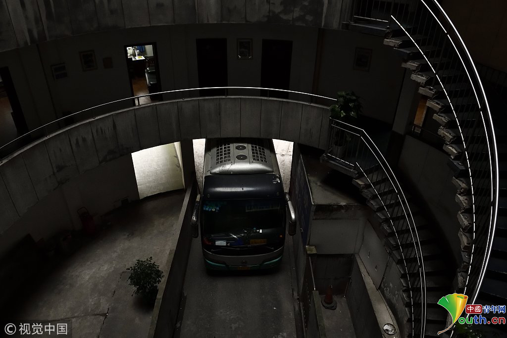2018年12月6日,重慶江北紅旗河溝汽車站內(nèi),有一棟獨(dú)特的八層圓環(huán)狀建筑,底層每天有不少進(jìn)出站的客車通行。據(jù)悉,這棟樓建于1990年,曾經(jīng)是車站旅館,如今一、二兩層用于車站辦公,其余樓層已廢棄。為確保安全,三層以上已經(jīng)被封鎖。圖為公交車穿過(guò)8層空心圓筒樓。徐勇/視覺中國(guó)