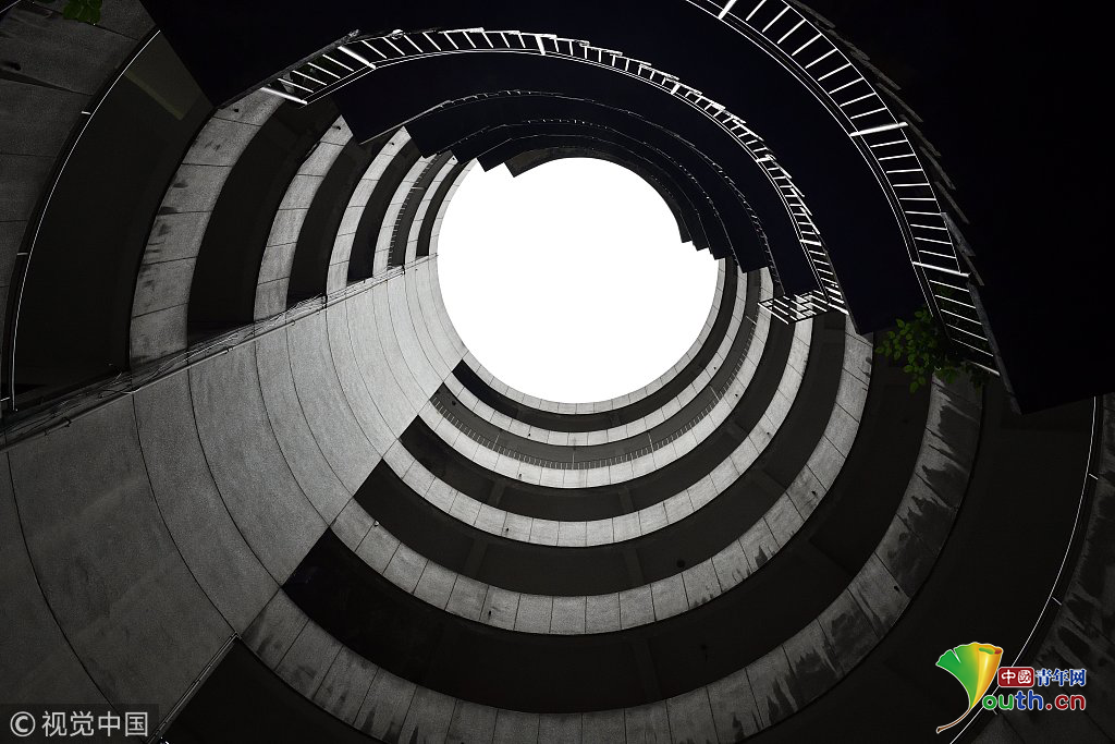 2017年9月27日,重慶,南岸區(qū)某小區(qū)的“螺旋”停車場(chǎng),從公路到車庫(kù)要下5層樓,司機(jī)需要轉(zhuǎn)無(wú)數(shù)個(gè)360度圈。圖片來(lái)源:視覺中國(guó)