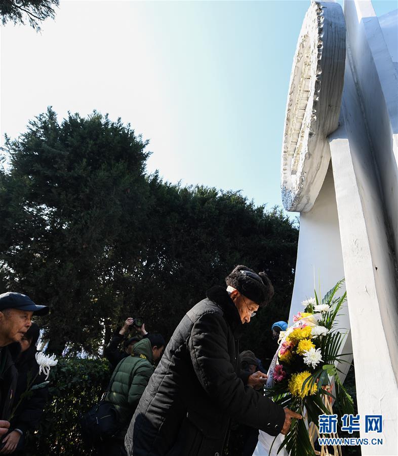 12月12日,來自湖南的抗戰(zhàn)老兵李湘炳(前)等在侵華日軍南京大屠殺中山碼頭遇難同胞紀念碑前祭奠遇難同胞。 當日,來自湖南、江蘇等地的4名抗戰(zhàn)老兵以及志愿者、南京當?shù)卮髮W生代表等來到侵華日軍南京大屠殺中山碼頭遇難同胞紀念碑前獻花、默哀,祭奠遇難同胞。 新華社記者 季春鵬 攝