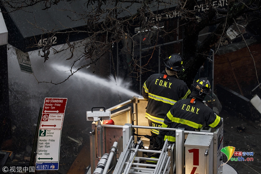 美國紐約,在紐約皇后區(qū)皇后大道,一場大火吞噬了六家商鋪,消防隊員正在努力撲滅火災余燼。十幾人受傷,包括6名消防員。圖片作者:Drew Angerer