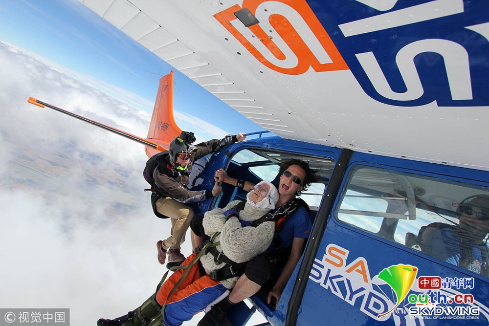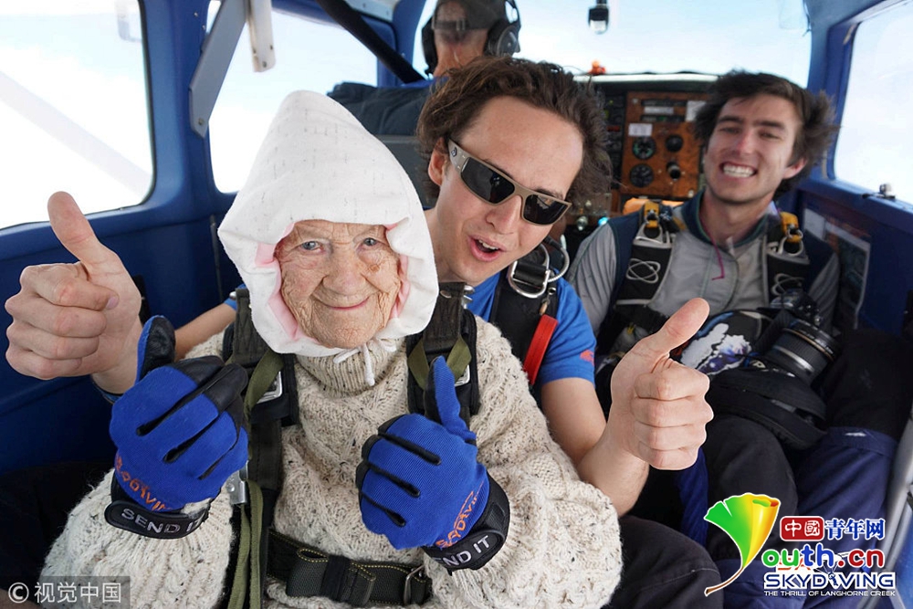 12月14日消息,澳大利亞一名102歲高齡的老奶奶日前刷新世界紀錄,她跟著教練從1萬4000英尺(約4300公尺)的高空一躍而下,成為全球最年長的跳傘玩家。
