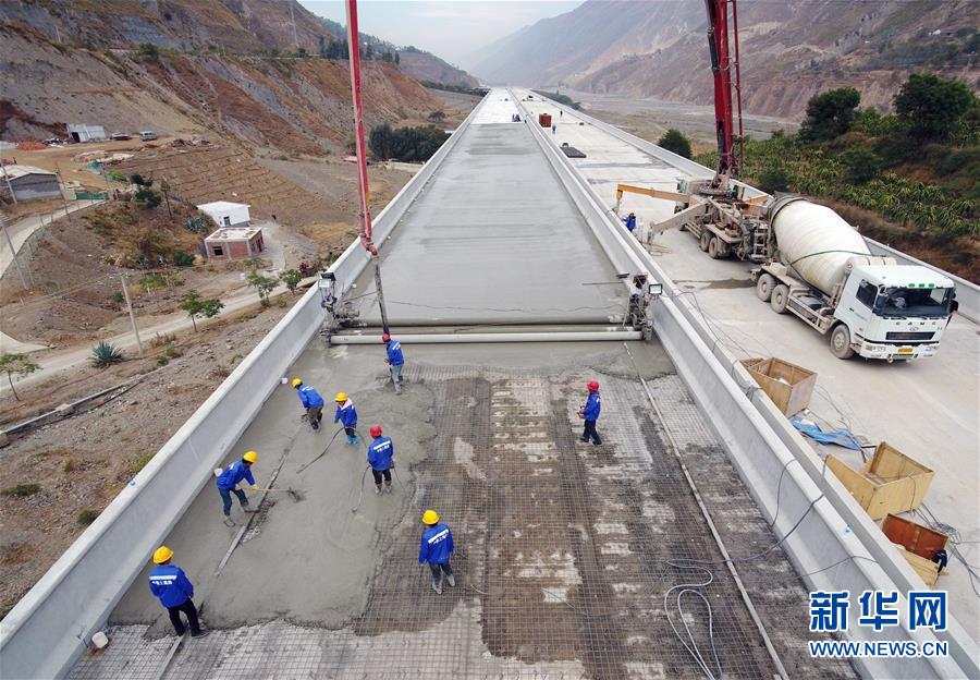 12月15日,中鐵上海局集團(tuán)公司的施工人員在東格高速公路土建項目中進(jìn)行橋面鋪裝作業(yè)(無人機(jī)拍攝)。 新華社記者楊宗友攝