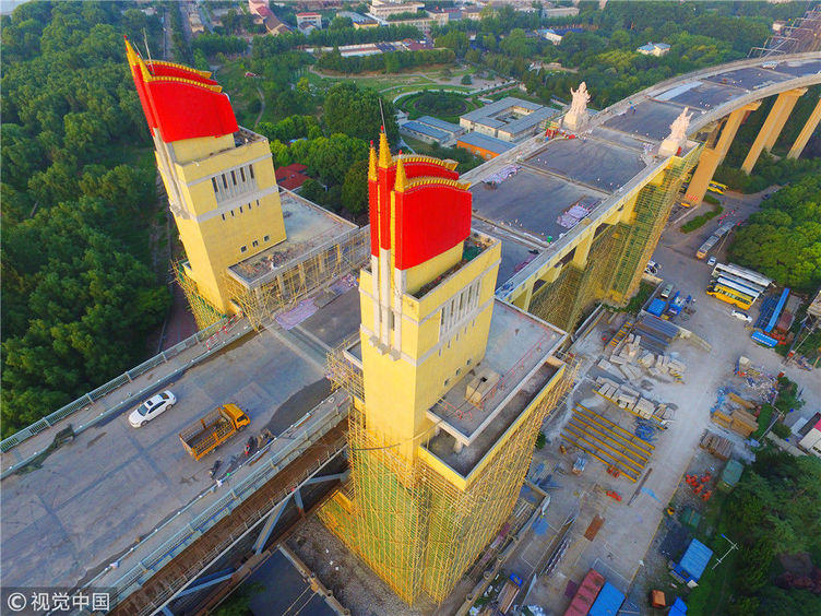 2018年6月24日,南京長(zhǎng)江大橋修葺一新的米黃色橋頭堡,鮮艷的三面紅旗。