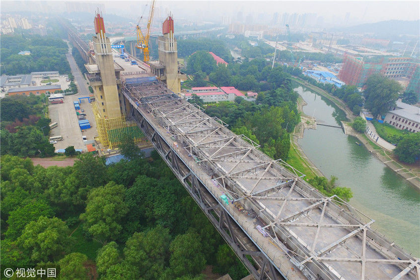 2017年9月19日,南京長江大橋正橋的混凝土面板已經(jīng)全部拆除,僅剩交錯(cuò)縱橫的鋼桁架橫跨在長江之上,從高空俯瞰猶如一條“鋼鐵巨龍”。