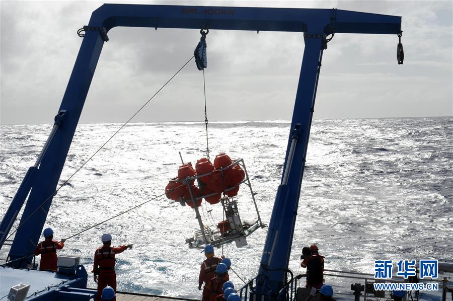 考察隊員在“沈括”號上回收“彩虹魚”著陸器(12月16日攝)。