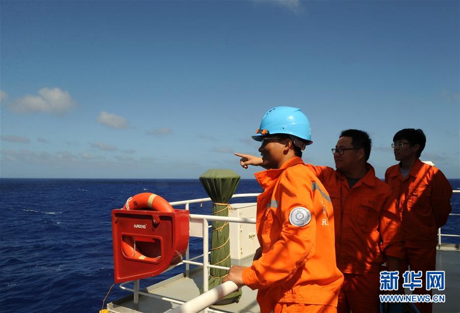 “彩虹魚”科考團(tuán)隊(duì)隊(duì)員搜尋浮出海面的著陸器(12月15日攝)。