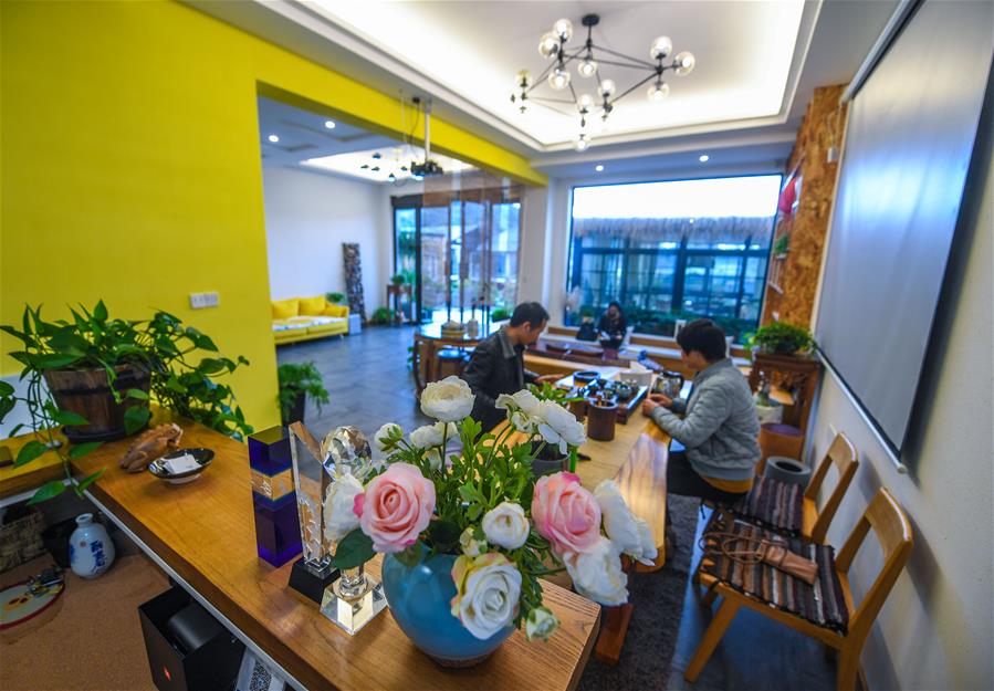 12月15日,客人在朱家尖烏石塘“漁夫客?!泵袼薮髲d喝茶。該民宿有海景房7間,餐飲包廂8個。 新華社記者 徐昱 攝
