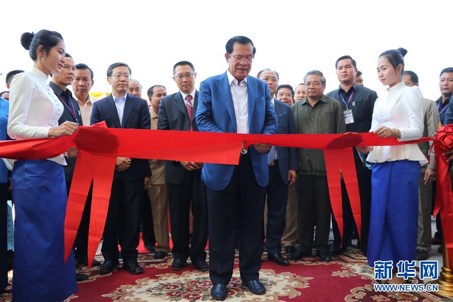 12月17日,柬埔寨首相洪森(中)在上丁省參加桑河二級水電站竣工投產(chǎn)儀式。