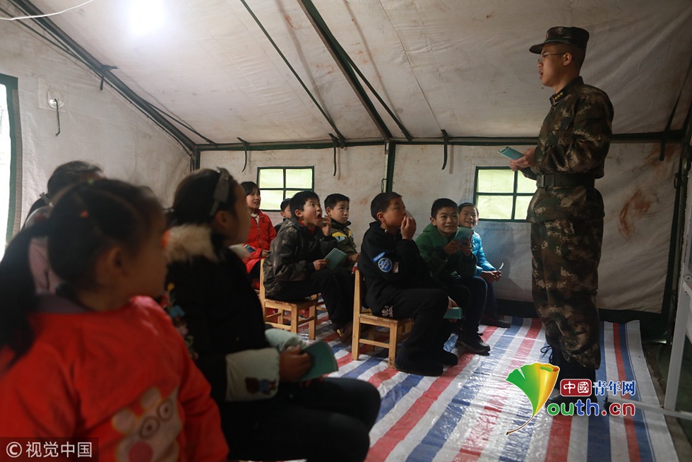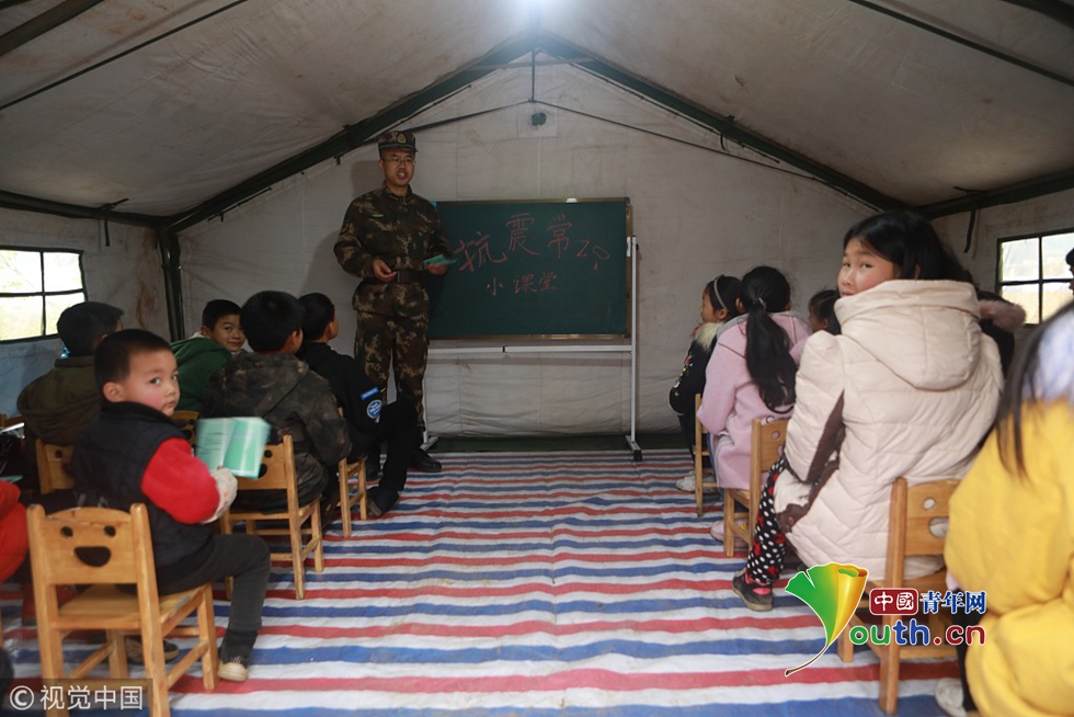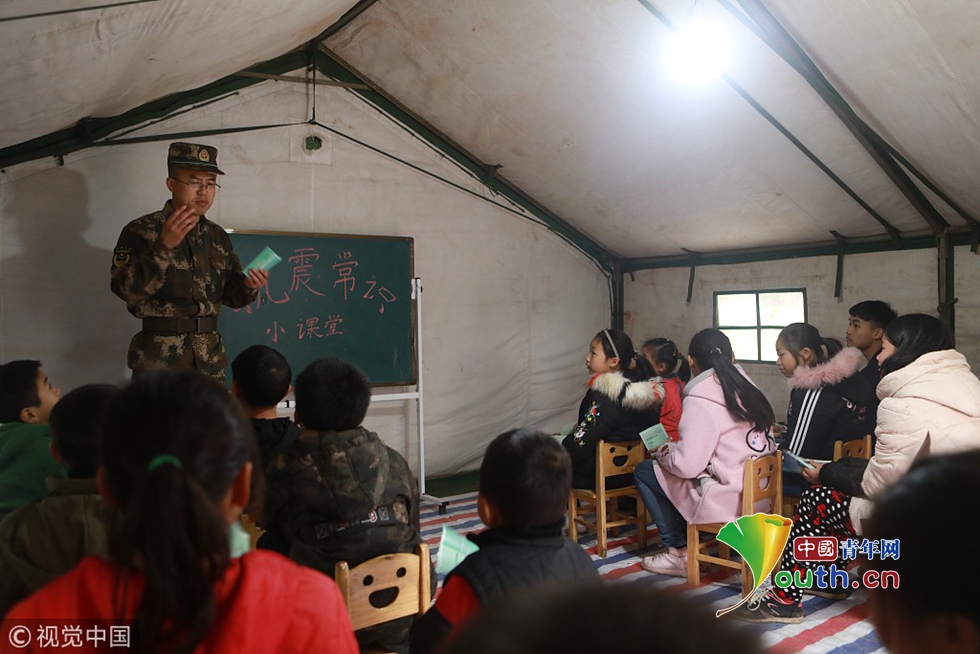 2018年12月18日,四川宜賓。武警宜賓支隊(duì)政治工作處宣傳保衛(wèi)股股長(zhǎng)朵祝偉為周家鎮(zhèn)新塘安置點(diǎn)的“帳篷學(xué)校”的學(xué)生上抗震常識(shí)課。圖片作者:謝江、劉崇達(dá)/視覺(jué)中國(guó)