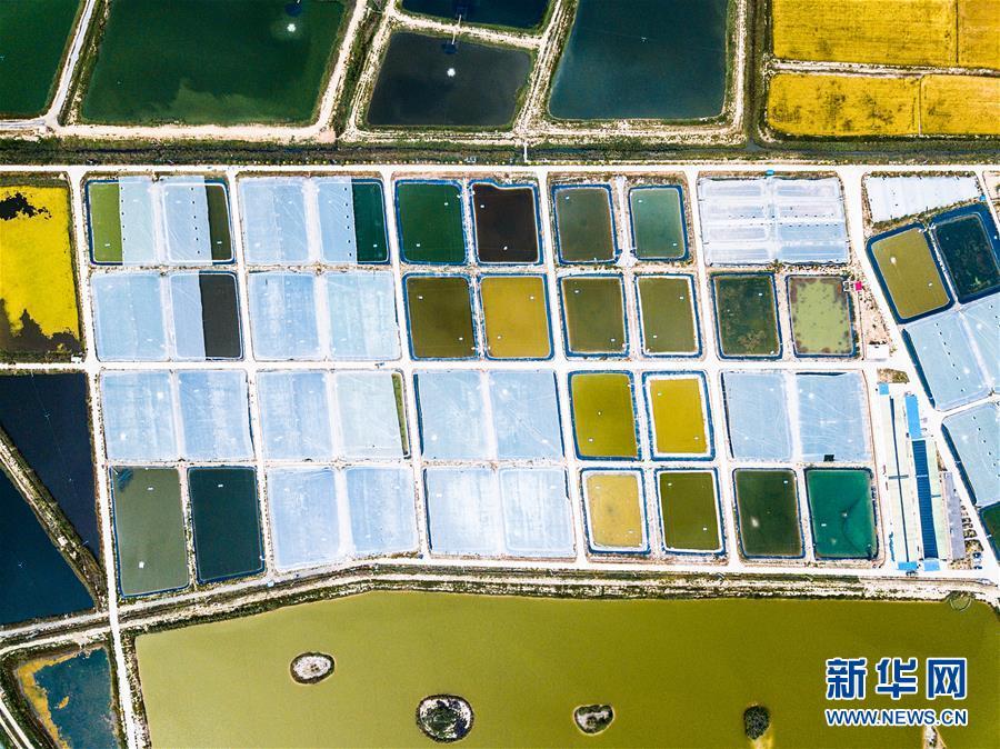 2018年9月11日航拍的寧夏賀蘭縣藍(lán)灣生態(tài)園南美對蝦養(yǎng)殖基地。 大地之色,俯仰之間;壯美山河,是我的祖國。2018年,新華社記者操縱無人機(jī)“飛閱”華夏大地,在最美的時(shí)節(jié),定格下她的色彩斑斕。 新華社記者 王建華 攝