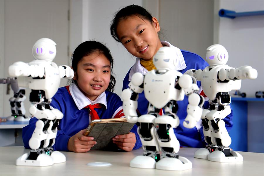 12月19日,武安市淑村鎮(zhèn)白沙學(xué)校的學(xué)生在練習(xí)操作機(jī)器人。新華社記者王曉攝
