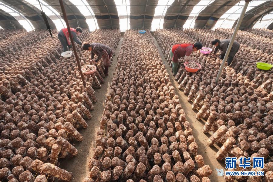 12月20日,唐山市豐潤區(qū)小美食用菌種植農民專業(yè)合作社社員在大棚內采摘香菇。 新華社記者 牟宇攝