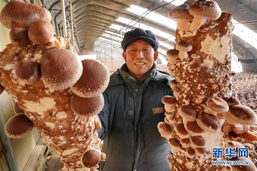12月20日,唐山市豐潤區(qū)小美食用菌種植農民專業(yè)合作社社員在展示種植的香菇。 新華社記者 牟宇攝