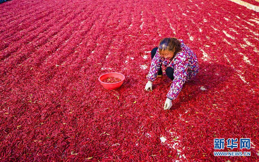 11月18日,在衡水市冀州區(qū)周村鎮(zhèn)辣椒加工交易基地,椒農在摘辣椒。