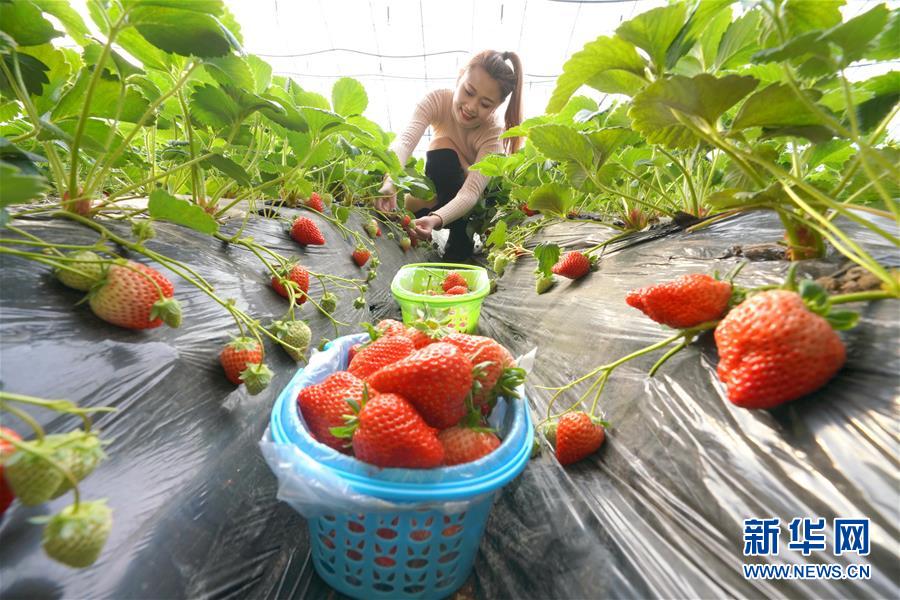 12月20日,游客在唐山市豐潤區(qū)眾浩草莓種植專業(yè)合作社大棚內采摘草莓。 新華社記者 牟宇攝