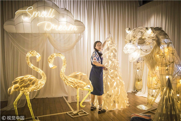 2018年5月6日,廣州,在天河區(qū)一家大商場辦個展時,用紙片做成的北極熊、大松樹、火烈鳥、紙房子在光線的配合下美輪美奐,吸引了很多顧客駐足?!皫缀趺總€人一看到,都會走進(jìn)那個夢幻的場景里,和這些紙雕一起合影?!眻D片攝于2018年5月6日。南塘/視覺中國