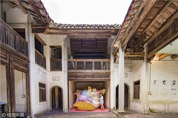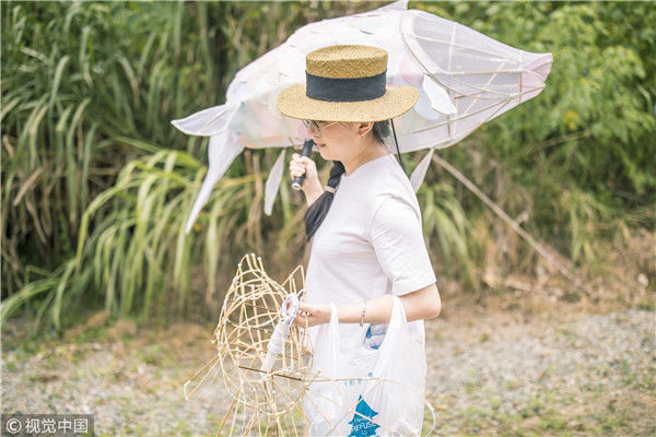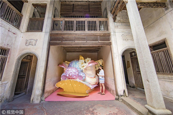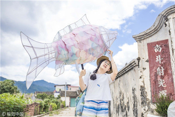 2018年8月10日,廣東揭陽,溫秋雯把獅子頭扒得只剩下骨架和包布,之后將不同顏色的紙片裁剪成三角形、鱗片形等不同形狀,作為裝飾獅子的皮毛,粘在獅子身上,獅子的鼻子則是用彩紙條以手鞠的方式纏繞而成,在獅頭內(nèi)部安裝了一盞白熾燈,一打開電燈,萌態(tài)可掬的獅子便呈現(xiàn)在人們眼前。紙片的顏色以淡粉、淡綠、淺白色為主,就這樣,人們平時(shí)印象中威猛的南獅,被改裝得萌萌的。圖為2018年8月10日,廣東省梅州市,溫秋雯和她的紙雕作品。