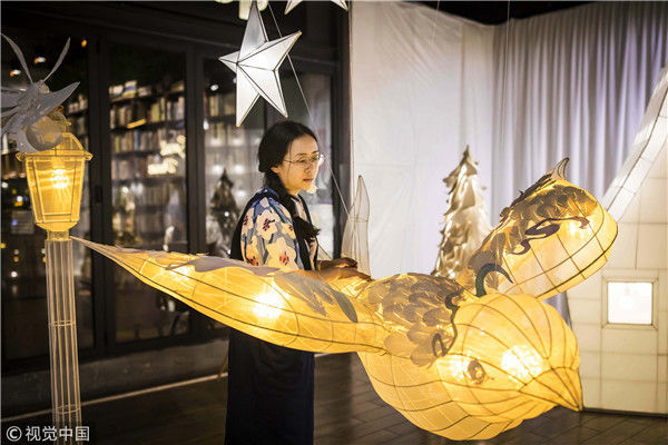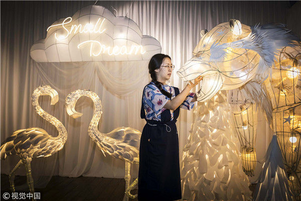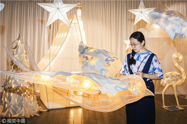 2018年5月6日,廣州,在天河區(qū)一家大商場辦個(gè)展時(shí),用紙片做成的北極熊、大松樹、火烈鳥、紙房子在光線的配合下美輪美奐,吸引了很多顧客駐足?!皫缀趺總€(gè)人一看到,都會(huì)走進(jìn)那個(gè)夢幻的場景里,和這些紙雕一起合影?!眻D片攝于2018年5月6日。南塘/視覺中國