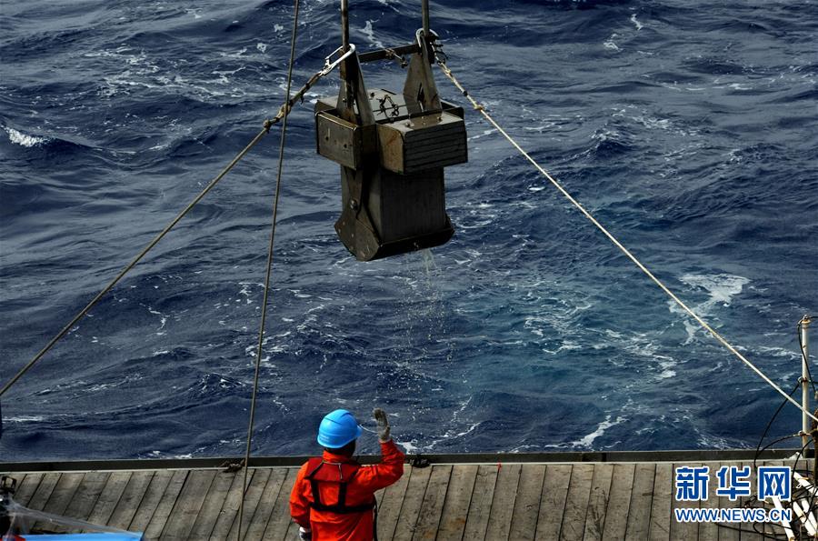 科考團(tuán)隊(duì)成員在船上回收箱式采樣器(12月20日攝)。