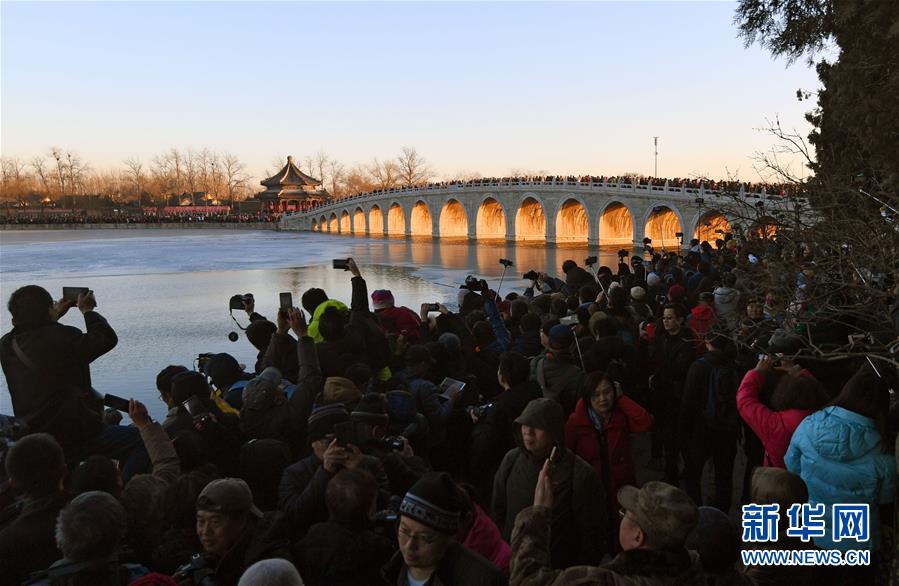 12月23日,游客和攝影愛(ài)好者在拍攝頤和園十七孔橋“金光穿洞”美景。 當(dāng)日,北京頤和園十七孔橋出現(xiàn)“金光穿洞”美景,吸引許多游客和攝影愛(ài)好者前來(lái)觀賞拍攝。 新華社記者陳曄華攝