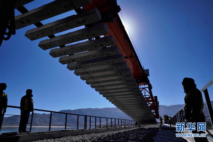 11月26日,施工人員在川藏鐵路拉林段貢嘎雅魯藏布江特大橋上鋪軌。 新華社記者 普布扎西 攝