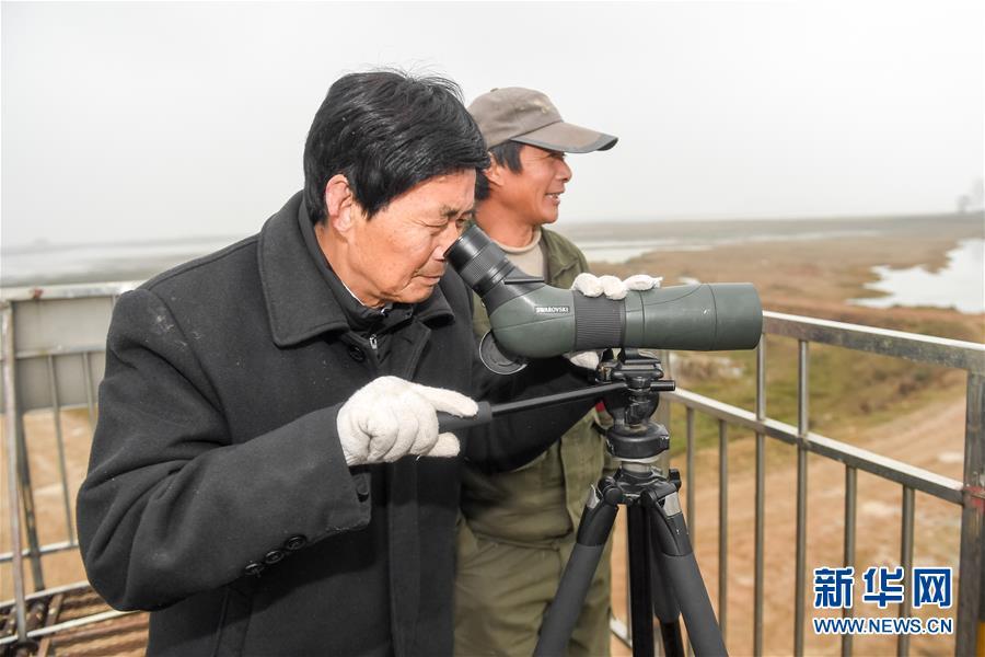 12月22日,王三益(前)在菜子湖濕地觀測(cè)候鳥(niǎo)。 新華社記者 張端 攝