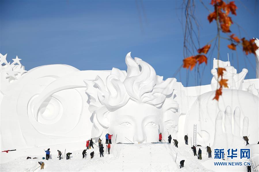 12月24日,雪雕師在制作太陽島雪博會(huì)主塑“星河之旅”。 當(dāng)日,哈爾濱太陽島雪博會(huì)主塑露出“芳容”。本屆雪博會(huì)主塑“星河之旅”長106米,高32米,寬20米,用雪量達(dá)4萬立方米。 新華社記者 王建威 攝
