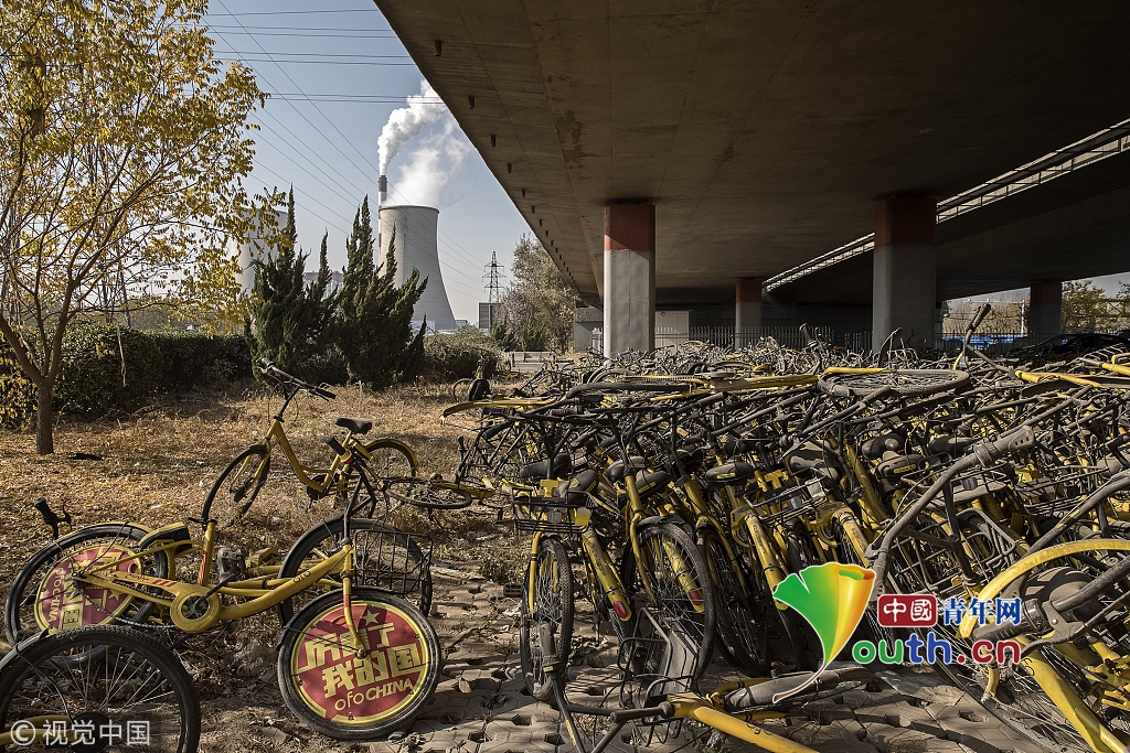 2018年11月22日,石家莊欒城。一座橋下的ofo小黃車堆積場(chǎng)。