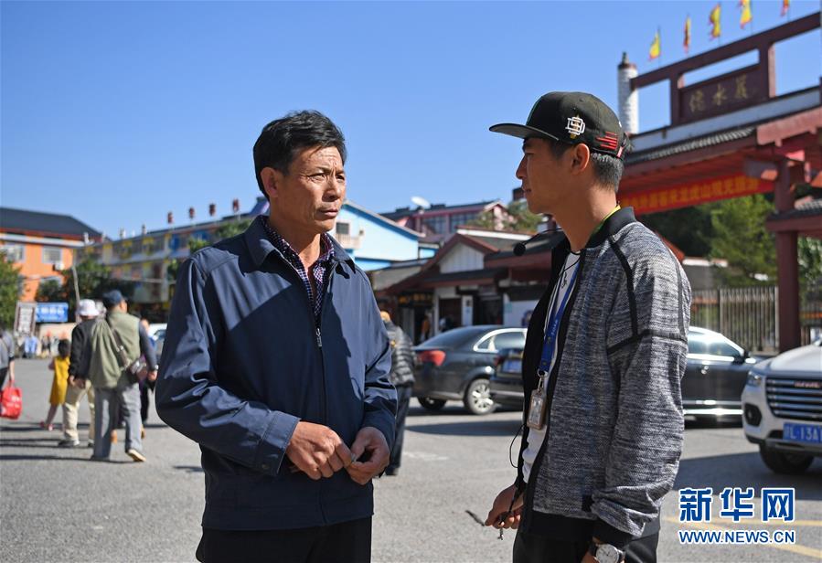 在龍虎山景區(qū)門口,舒港發(fā)囑咐做導游的小兒子舒志剛注意游客的安全(10月28日攝)。