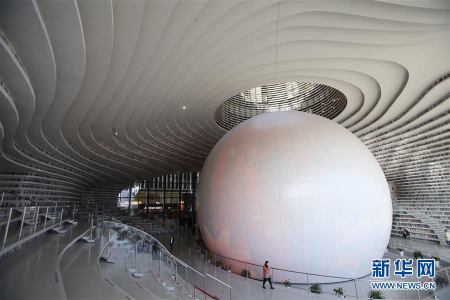 這是12月27日拍攝的天津?yàn)I海新區(qū)圖書館中庭。 濱海新區(qū)圖書館位于天津?yàn)I海文化中心,2017年10月1日正式開(kāi)館,設(shè)計(jì)立意為“濱海之眼”和“書山有路勤為徑”。圖書館現(xiàn)有藏書60多萬(wàn)冊(cè),一年多來(lái)接待讀者約280萬(wàn)人次,已成為濱海新區(qū)的文化“新地標(biāo)”。 新華社記者李然攝