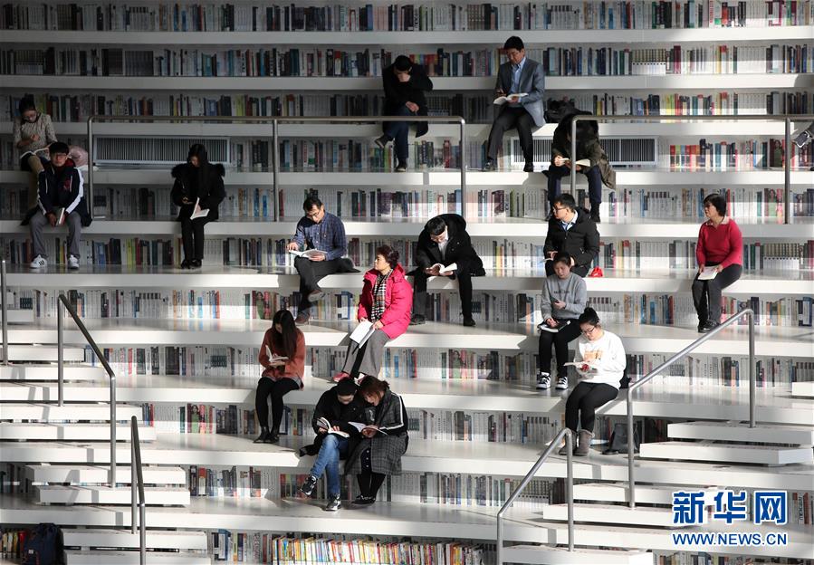12月27日,讀者在天津?yàn)I海新區(qū)圖書館中庭的“書山”上看書。 濱海新區(qū)圖書館位于天津?yàn)I海文化中心,2017年10月1日正式開(kāi)館,設(shè)計(jì)立意為“濱海之眼”和“書山有路勤為徑”。圖書館現(xiàn)有藏書60多萬(wàn)冊(cè),一年多來(lái)接待讀者約280萬(wàn)人次,已成為濱海新區(qū)的文化“新地標(biāo)”。 新華社記者伍婧丹攝