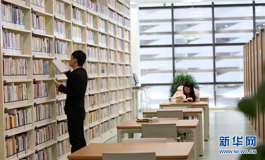 12月27日,在天津?yàn)I海新區(qū)圖書館,工作人員(左)在閱覽室中擺放圖書。 濱海新區(qū)圖書館位于天津?yàn)I海文化中心,2017年10月1日正式開(kāi)館,設(shè)計(jì)立意為“濱海之眼”和“書山有路勤為徑”。圖書館現(xiàn)有藏書60多萬(wàn)冊(cè),一年多來(lái)接待讀者約280萬(wàn)人次,已成為濱海新區(qū)的文化“新地標(biāo)”。 新華社記者伍婧丹攝