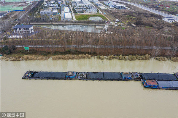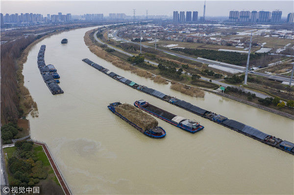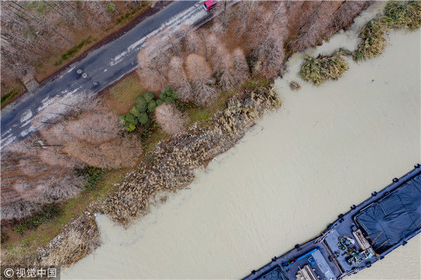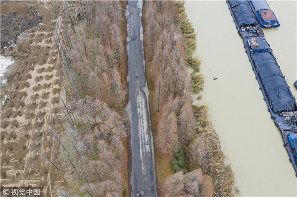2018年12月27日,江蘇淮安,航拍京杭大運(yùn)河淮安段冬日景色。吳揚(yáng)/視覺(jué)中國(guó)
