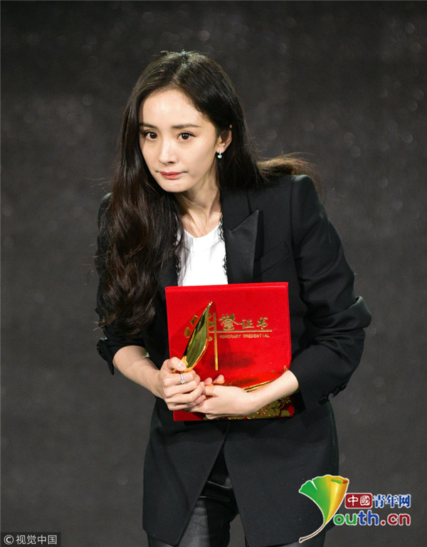 楊冪上臺(tái)領(lǐng)獎(jiǎng)西裝精致干練 談話間舉手顯呆萌