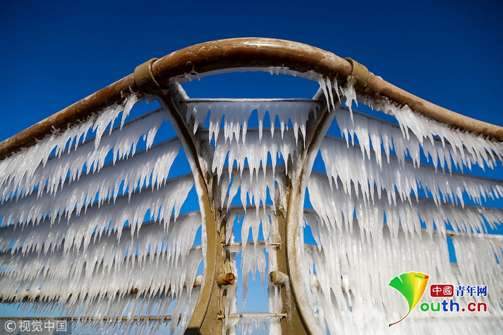 2018年12月29日,大連市迎來入冬以來最冷-12℃的低溫,在大風(fēng)和潮汐的作用下,海水在岸邊的護欄上瞬間凝固,凝結(jié)并形成大面積形狀各異的冰凌,在延綿5公里的木棧道上形成奇特的冰凌奇觀。