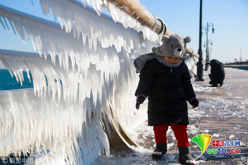 渤海海水在北風(fēng)的作用下涌向岸邊,在大連東港海岸護(hù)欄上凝結(jié)成冰凌,形成約有兩公里的冰凌奇觀。圖為大連市東港海岸護(hù)欄結(jié)滿晶瑩剔透的冰棱。圖片來源:視覺中國