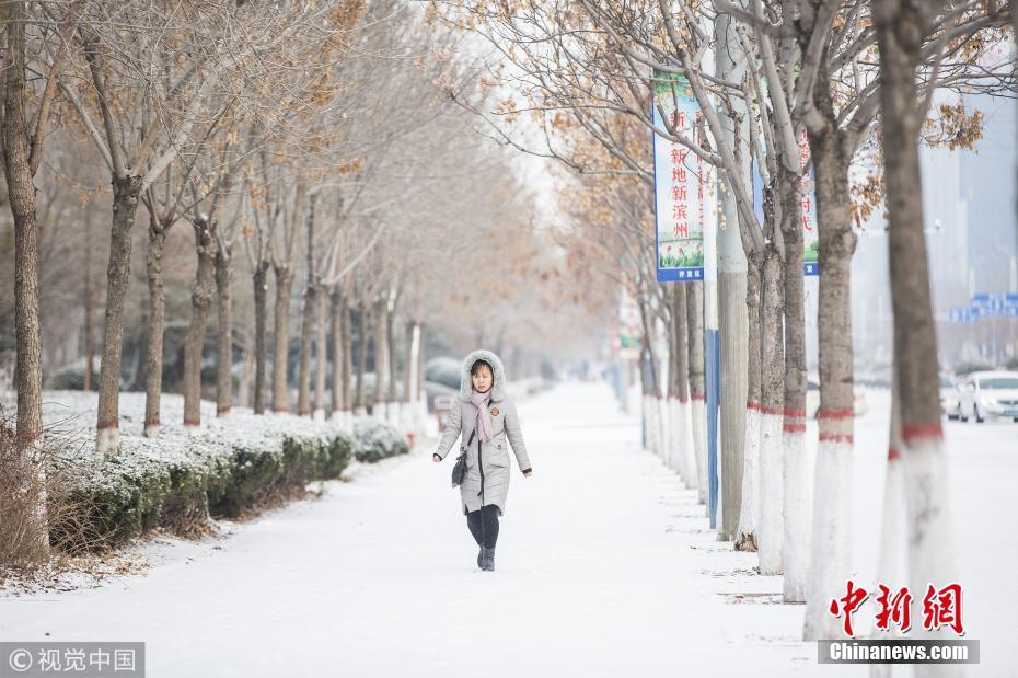山東濱州發(fā)布道路結(jié)冰黃色預(yù)警信號市區(qū)出現(xiàn)較明顯降雪,路表溫度低于0℃。圖片來源:視覺中國