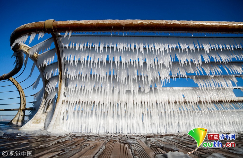 晶瑩剔透的冰凌錯落有致的懸掛在東港海岸的木棧道護(hù)欄上。