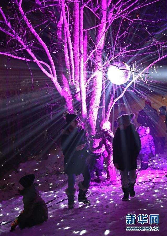 2018年12月31日,在芬蘭南部城市埃斯波,人們?cè)跓艄恻c(diǎn)綴的公園內(nèi)玩耍。