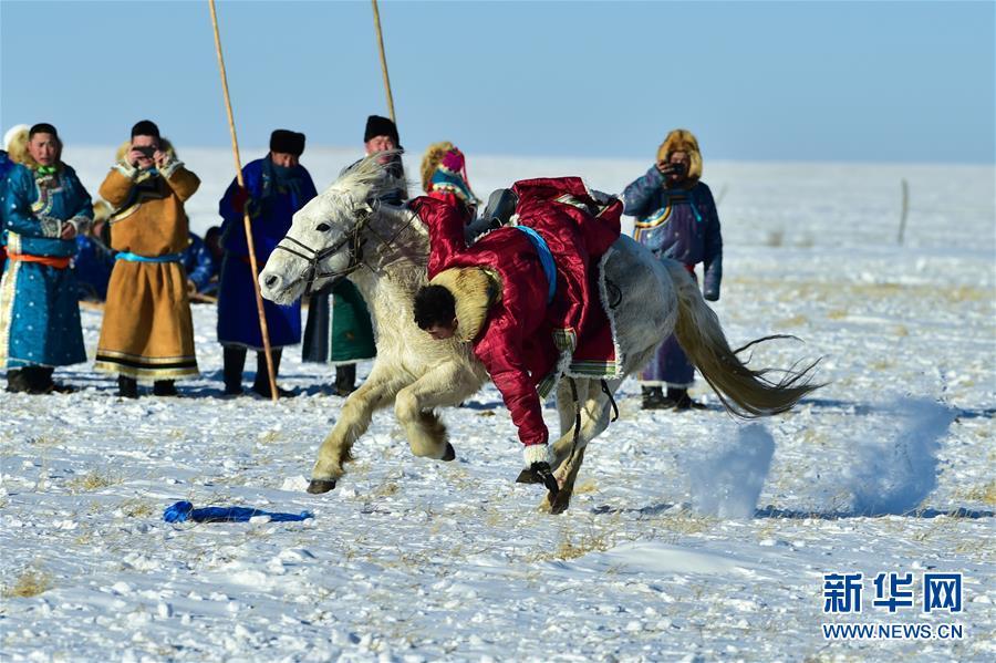 1月8日,牧民表演馬背拾哈達(dá)。 時(shí)下正值草原冬季旅游旺季,內(nèi)蒙古自治區(qū)西烏珠穆沁旗的牧民們?cè)谘┰弦徽股硎?,為游客展現(xiàn)獨(dú)特的民族風(fēng)情。 新華社記者 鄒予 攝